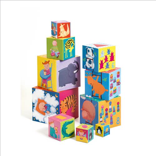 10 divertentissimi cubi di cartone impilabili con raffigurati animali, alberi e fiori sulle facce.