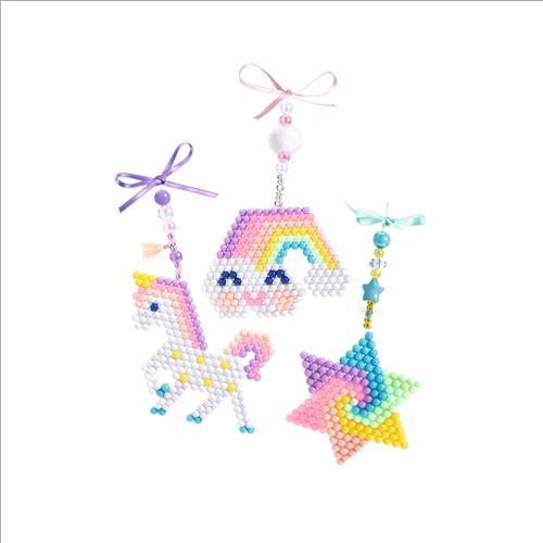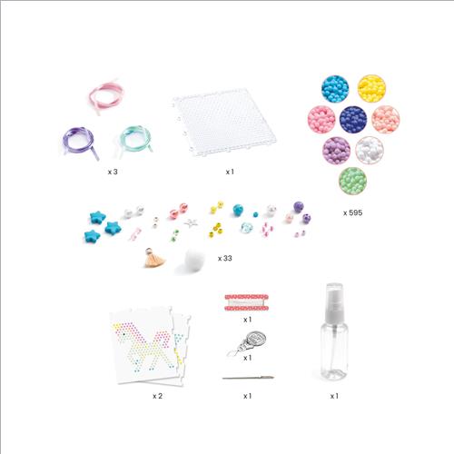 Un kit per creare 3 ciondoli in colori pastello con biglie che si attaccano con l’acqua. I bambini posizionano il modello sotto la piastra a nido d’ape trasparente. Posizionano le perline colorate per riprodurre il modello proposto, quindi spruzzanoacqua sul modello realizzato. Una volta asciutte, le perline rimangono attaccate l’una all’altra come per magia!