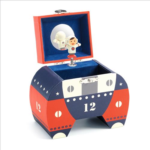 Polo 12 è un carillon a forma di missile con belle illustrazioni. Girate la chiave, aprite la scatola e sorpresa: un astronauta dai dettagli raffinati gira e si riflette su uno specchio sagomato sulle note di Take me Out to the Ball game di AlbertVon Tilzer.