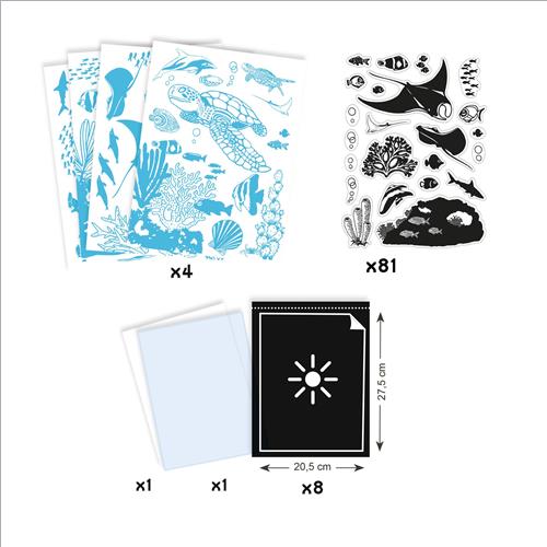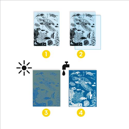 Questa magica attività si ispira a un procedimento preso in prestito dalla fotografia: la cianotipia. Con l’aiuto di motivi opachi, il bambino o la bambina crea scene illustrate su carta fotosensibile. Dopo l’esposizione al sole la carta è contrassegnata da motivi in negativo. Bisogna solo risciacquare la carta in una vasca con acqua pulita e le creazioni si rivelano su fondo blu! Con 4 pennarelli per trasformare i 4 quadri in fondali sottomarini multicolore.