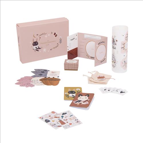 Tutti i tuoi primi ricordi, raccolti in una scatola illustrata. Piccoli quaderni, immagini da distribuire, adesivi, borse di stoffa o scatole del tesoro e persino un poster con il tuo albero genealogico… Tutto si riunisce e può essere riposto con cura.