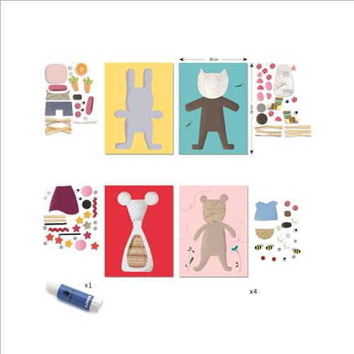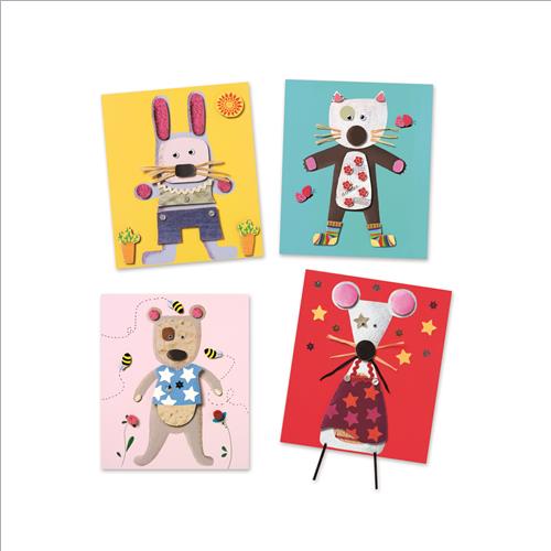 Per le piccole, grossi pezzi di cartone ondulato e divertenti accessori per realizzare quattro quadri semplici e pieni di tenerezza.