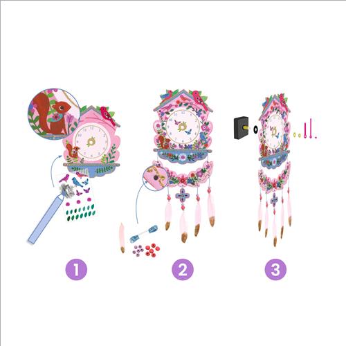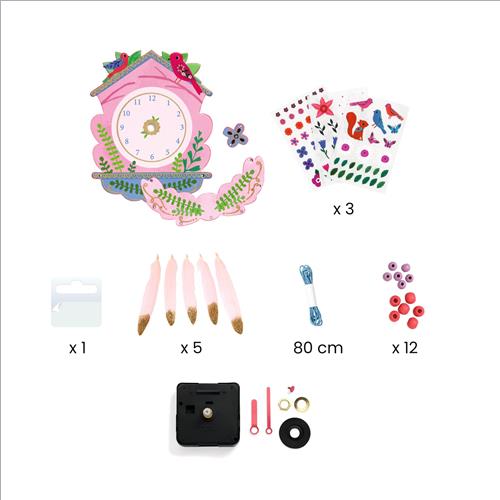 Un kit creativo per realizzare un orologio da decorare e assemblare con più di 100 decalcomanie e accessori. Con una matita, il bambino strofina le decalcomanie per trasferirle sui tre pezzi di cartone robusto che costituiranno l’orologio. Poi posiziona i fili decorati con perline colorate e piume scintillanti. Non resta che assemblare il meccanismo. Un bellissimo oggetto decorativo che indica l’ora.