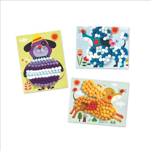 Collage per i più piccoli. Sulle tavole disegnate si leva la carta protettiva e si scopre la zona adesiva da decorare con morbidi pompons. Appariranno tre dolcissimi cagnolini.