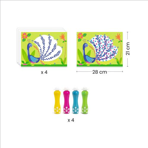 Con grandi pennarelli mousse. Punto dopo punto, il bambino riempie le sagome degli animali. Può disegnare dei punti uno accanto all’altro o sovrapposti per realizzare scenari colorati. Non rimane che chiudere la tasca e scoprire graziose tavole.