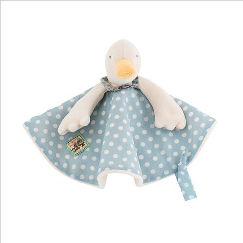 Dudu in tessuto con il personaggio dell’ochetta Jeanne, con il suo abitino azzurro a pois foderato in velluto, per sensazioni tattili diverse. Ha anche un gancetto portaciuccio.