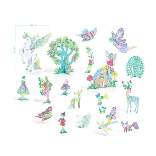 Un kit creativo con una miriade di pezzi di cartone da colorare e assemblare per creare un mondo magico fatto di personaggi e scene da favola. Tutto il piacere creativo di colorare associato all’attività di costruire oggetti in volume.