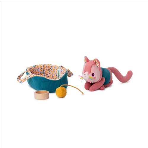 Questo cesto accoglie l’adorabile gattina Jeanne, con la sua giacca removibile, ciotola e pallina di lana. Il bambino si prende cura di lei, accarezzandola e nutrendola con attenzione. Jeanne, che adora essere coccolata, risponde con dolci miagolii.