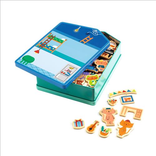 Il bambino gioca con 40 magneti in legno su una scatola metallica a forma di casa per divertirsi ad animare e decorare i 6 ambienti (la soffitta, la camera, la cucina, il salone, il bagno e la stanza dei giochi).