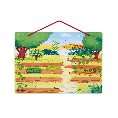 Un tabellone magnetico da appendere o appoggiare con 70 magneti per comporre un giardino variopinto! Il bambino potrà dare libero sfogo alla sua immaginazione mentre impara il nome di frutta e verdura. All’interno è presente un poster didattico fronte-retro in 6 lingue.