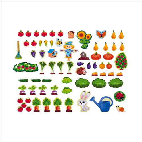 Un tabellone magnetico da appendere o appoggiare con 70 magneti per comporre un giardino variopinto! Il bambino potrà dare libero sfogo alla sua immaginazione mentre impara il nome di frutta e verdura. All’interno è presente un poster didattico fronte-retro in 6 lingue.