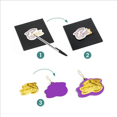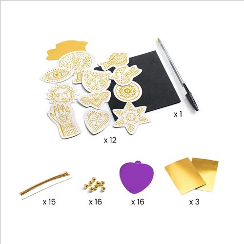 Un’attività originale di goffratura che permette di creare 12 amuleti portafortuna. È sufficiente ricalcare le illustrazioni stampate sul retro degli adesivi metallizzati e, come per magia, il rilievo compare dall’altro lato. 12 amuleti da collezionare nell’astuccio fornito o da regalare.