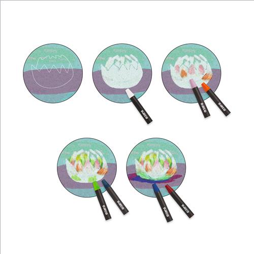 Contenuto: 3 schede da completare che formano un trittico + 12 pastelli.