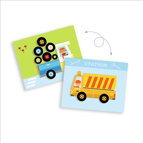 Il bambino o la bambina gioca con calamite di legno su una scatola di metallo sottile. Riproduce i 12 veicoli rappresentati sulle carte scegliendo il lato giusto della scatola.