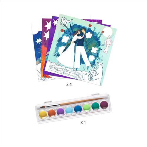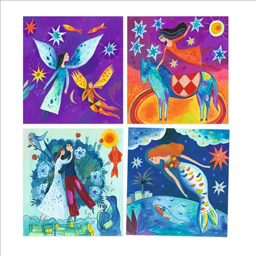 Un’attività di pittura con illustrazioni ispirate allo stile del grande maestro surrealista Marc Chagall. I bambini aggiungono tocchi di colore e li sovrappongono per rivelare i segreti di questi personaggi che fluttuano nell’aria.