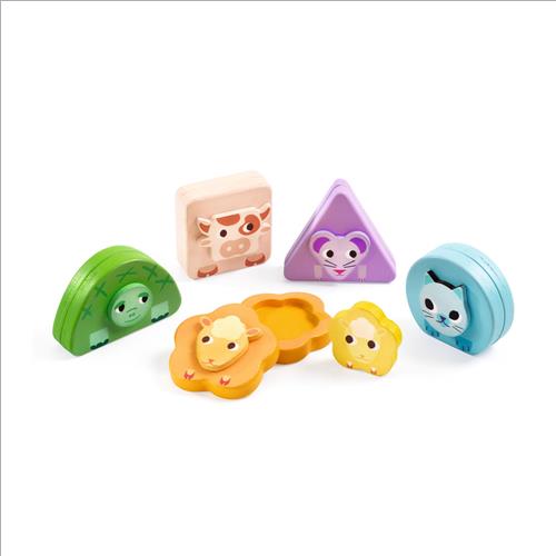 Gioco di nascondino magnetico. Cinque animali della fattoria che si aprono lasciando apparire un cucciolo della stessa forma geometrica del genitore.