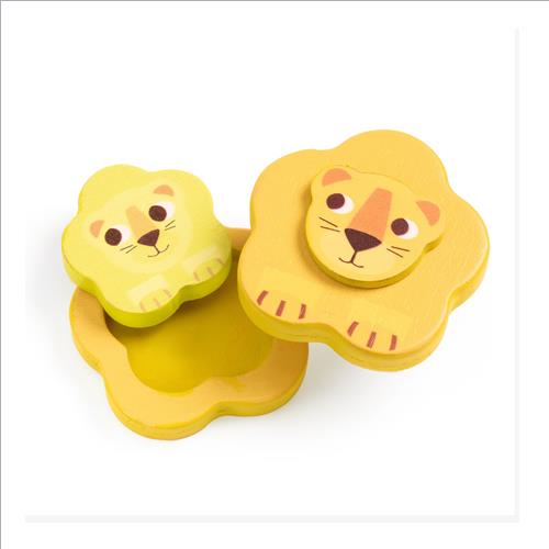 Gioco di nascondino magnetico. Cinque animali della fattoria che si aprono lasciando apparire un cucciolo della stessa forma geometrica del genitore.