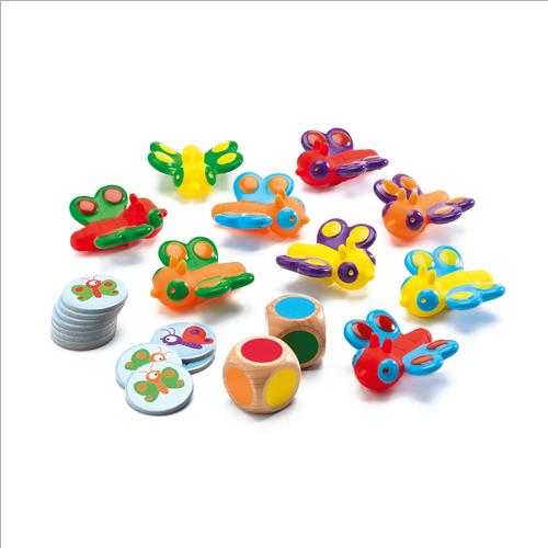 Le farfalline svolazzano in giardino. Osservatele con attenzione e prendete il più velocemente possibile la farfalla giusta!I dadi indicano una combinazione di colori. Il giocatore che prende per primo la farfalla con le ali degli stessi colori dei dadi vince un gettone.