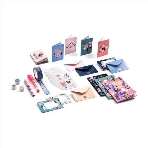 Contenuto: 1 scatola con finestra (18 x 15,5 x 3 cm) con 15 mini cartoncini + 15 mini buste+ 4 fogli di stickers + 1 nastro adesivo + 1 penna a gel + 1 matita + 3 gomme + 3 mini quaderni.