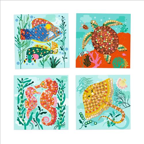 Un cofanetto per accostarsi all’arte del mosaico. 4 quadri da decorare incollando quadratini di gommapiuma metallizzati. Il bambino individua i numeri, quindi incolla i pezzi corrispondenti alla disposizione designata. I quadri si riempiono e il mondo marino si adorna di raggi scintillanti.
