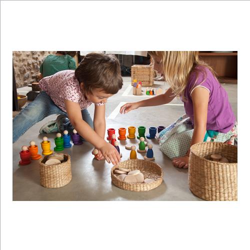 Questo gioco è legato alla pedagogia Waldorf: grazie al design semplice, forme morbide e il materiale naturale e caldo del legno, i bambini sono incoraggiati a giocare lavorando su piccole abilità motorie e facendo viaggiare la loro immaginazione mentre si divertono.