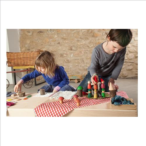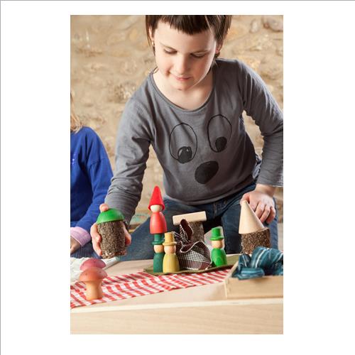 Il materiale in legno ecosostenibile non è strutturato, ciò consente di utilizzare le componenti del gioco in molti modi e saranno i bambini asviluppare le loro avventure e a decidere con quale personaggio giocare, in linea con la filosofia Waldorf e il metodo educativo Montessori.