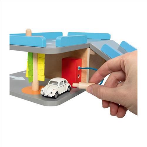 Mini garage in legno, completo di rampa, impianto di lavaggio auto con panno in feltro e distributore di benzina con pompa.