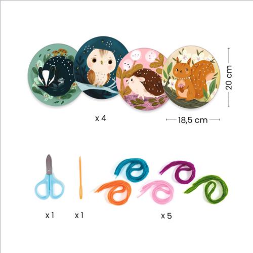Un’introduzione al ricamo! Il bambino impara 2 punti di ricamo diversi ma molto semplici. 4 tavole animali ricamati per decorare la cameretta.