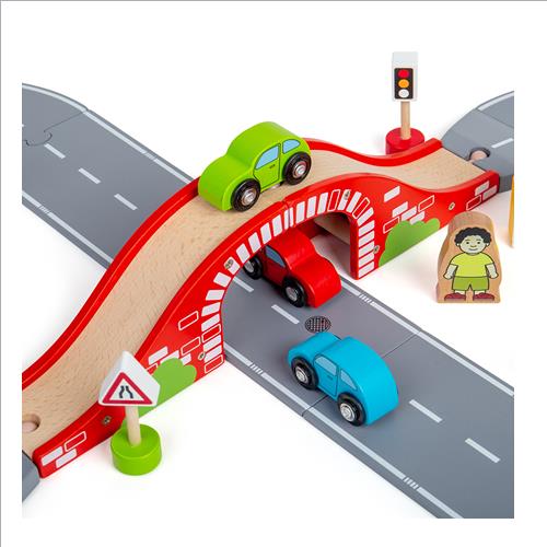 Contiene 15 pezzi in legno per la strada, un ponte, 3 personaggi, 2 alberi, 1 casa e3 segnali stradali.