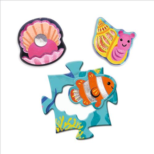 Puzzle gigante da 32 pezzi. Il bambino assembla il puzzle e posiziona ogni animale lucente: Pesce, riccio di mare, granchio eremita, granchio, conchiglia.