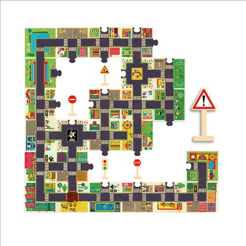 Un puzzle da 24 pezzi componibile in diversi modi, completo di 5 segnali stradali per giocare con le proprie macchinine e imparare le regole della strada.