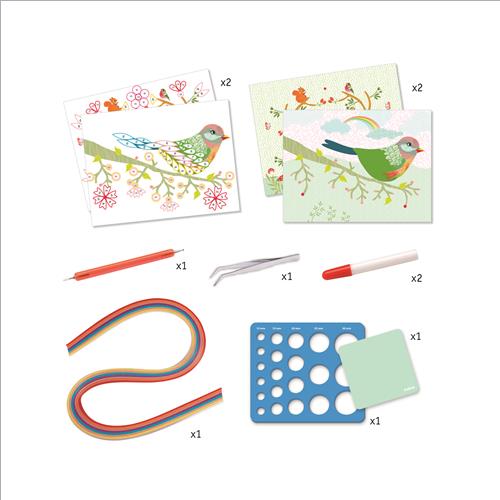 145 strisce di carta colorata, lo strumento per arrotolare, pinzette, colla e lo strumento per le misure delle spirali di carta, oltre a due tavole, illustrate da Aurélia Fronty, da decorare.