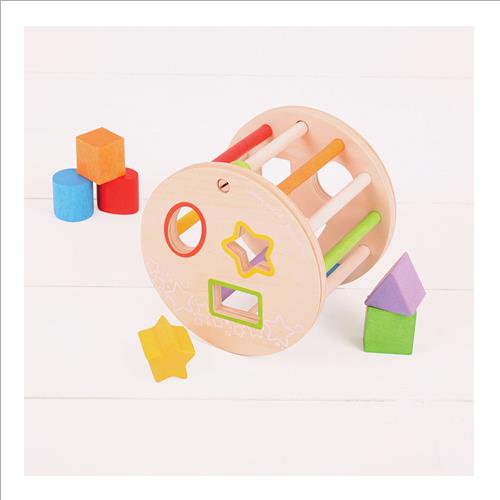 Inserisci le forme di legno colorate nella fessura corretta sulla parte superiore. Una volta pieno il sorter in legno può essere fatto rotolare per sentire tutte le forme tintinnare al suo interno!