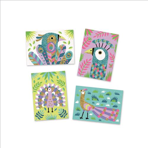 Con questa scatola si creano quattro splendide tavole, disegnate da Ameélie Fontaine, con la tecnica delle sabbie e dei glitter. Si toglie la carta protettiva prefustellata, per scoprire la parte adesiva, si versa la sobbia o il glitter … et voilà,l’opera d’arte è in corso.