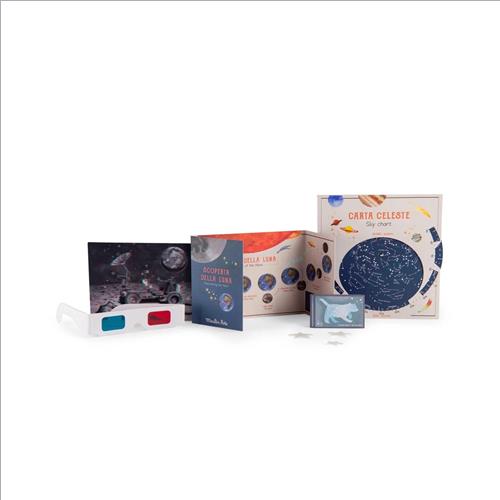 Contiene: 1 libro di attività, 16 carte di astronomia, 1 volantino sulla luna, 5 carte 3D e occhiali 3D, 10 carte costellazioni, 30 stelle fosforescenti da appendere, 1 mappa del cielo, 1 poster del sistema solare e 8 Pianeti e il Sole da appendere.
