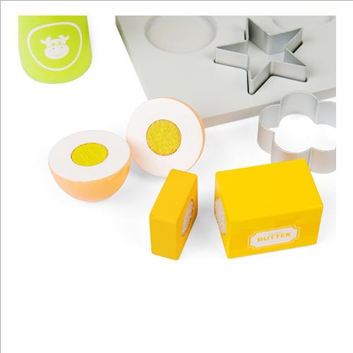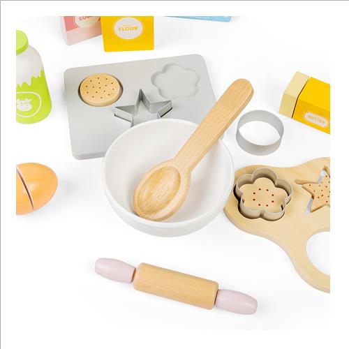 Invita i tuoi piccoli a unirsi a te in cucina per preparare una (finta) serie di biscotti con il loro set da forno in miniatura per bambini. Il set è composto da teglia in legno, bilancia da cucina, tagliapasta, mattarello, ciotola, burro a fette, unuovo, farina, zucchero e latte.