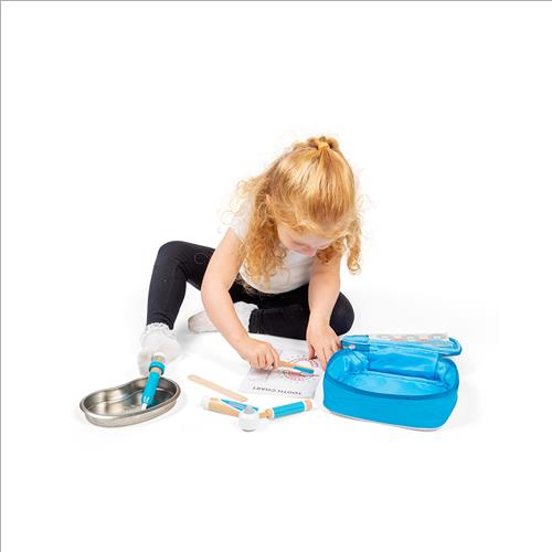 Questo divertente set include una borsa blu per il trasporto e strumenti realistici come uno spazzolino da denti in legno, un tubetto di dentifricio, una siringa, un otoscopio, un abbassalingua, una pinzetta, una mascherina, un vassoio in acciaio inossidabile, un foglio di adesivi e una tabella dei denti.