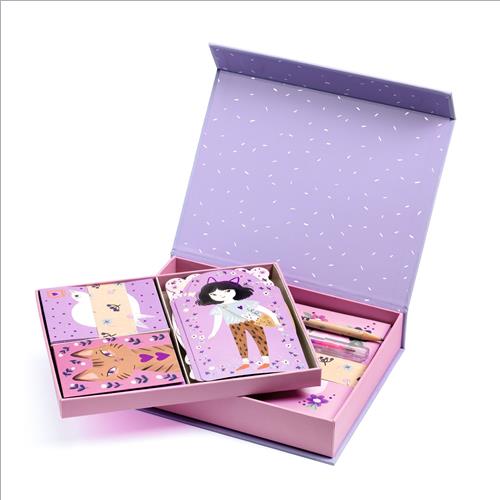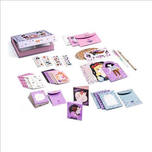 Contenuto: 1 scatola magnetica con scomparto rimovibile (21 x 16 x 4 cm) che contiene 15 cartoncini piccoli + 15 buste piccole + 15 cartoncini grandi + 15 buste grandi + 10 fogli di decalcomanie + 10 fogli di stickers + 1 penna a gel + 1 matita.