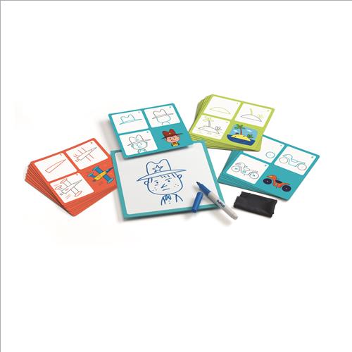 Il set contiene una lavagnetta, un pennarello cancellabile, un cancellino e 24 schede illustrate.