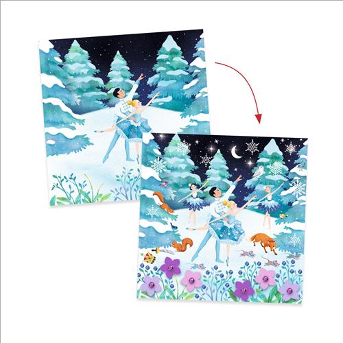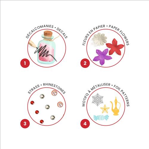 Il bambino o la bambina abbellisce ogni quadro con decalcomanie, fiori di carta, strass autoadesivi e motivi da metallizzare. 4 attività per un divertimento quadruplicato!