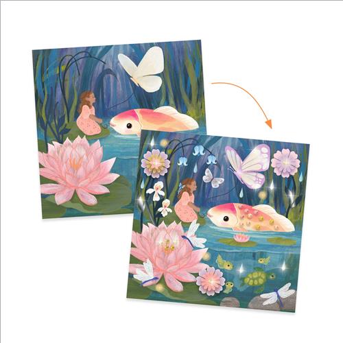 Il bambino abbellisce ogni quadro con decalcomanie, fiori di carta, strass autoadesivi e motivi da metallizzare. 4 attività per un divertimento quadruplicato!