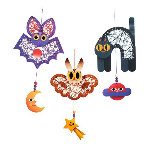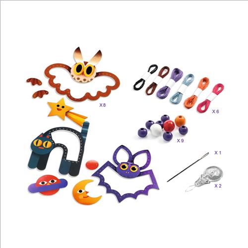 Un kit per creare 3 addobbi decorativi Nocturnes . Con l’aiuto di un ago con punta tonda, il bambino infila i fili nelle carte preforate e li incrocia fino a dare forma ai personaggi da completare. Completa poi le sue creazioni aggiungendo pendenticon perle in legno.