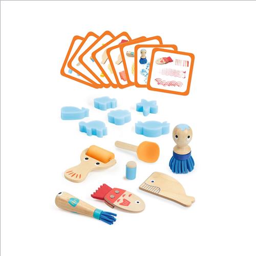6 strumenti di legno e 6 spugne. 10 carte con spiegazioni.