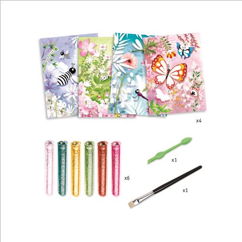 Con questa scatola si creano quattro splendide tavole, disegnate da Peggy Nille, con la tecnica dei glitter. Si toglie la carta protettiva prefustellata, per scoprire la parte adesiva, si versa il glitter … et voilà, l’opera d’arte è in corso.