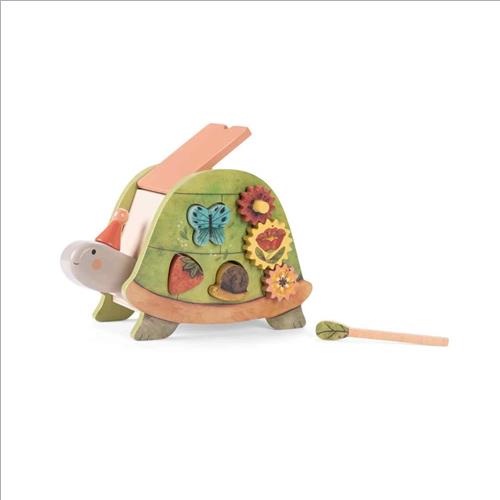 Bellissima tartaruga piena di attività in legno per bambini! Ognuna delle 4 facce gli promette attraenti scoperte di gioco e di apprendimento: pallottoliere, forme da incastrare, ruote dentate da girare, specchio, xilofono…
