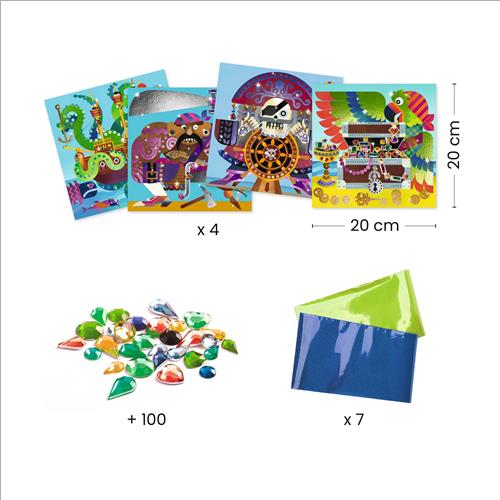 All’arrembaggio! Un’attività di collage per decorare 4 quadri a tema pirati con schede metallizzate e brillantini. Grazie ai codici colori indicati sui fogli, il bambino individua le aree da metallizzare. Con l’aiuto di uno strumento, scopre la pellicola che protegge la superficie incollata, quindi vi colloca la scheda metallizzata. Il materiale si deposita come per magia! In seguito, incolla i brillantini per illuminare i quadri.
