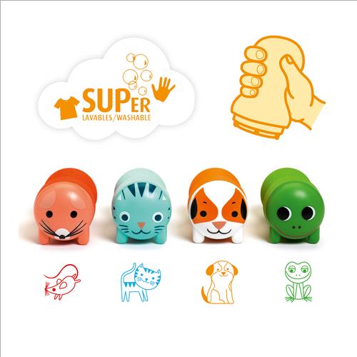 4 timbri ergonomici e autoinchiostranti creati da Djeco. Un’impugnatura in schiuma specialmente adattata alle piccole mani e timbri autoinchiostranti che segnano bene.