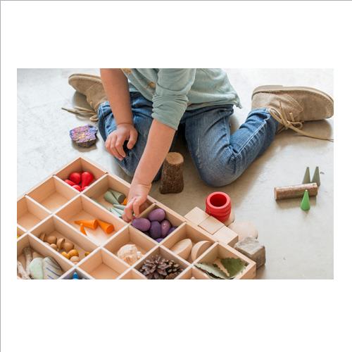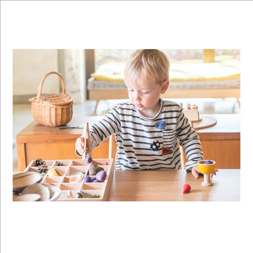 Questo vassoio con divisori permette di offrire una grande varietà di materiali allo stesso tempo. Gli scomparti contengono e delimitano e così i bambini possono ordinare e classificare tutti quei piccoli elementi che fanno parte del loro ambiente.